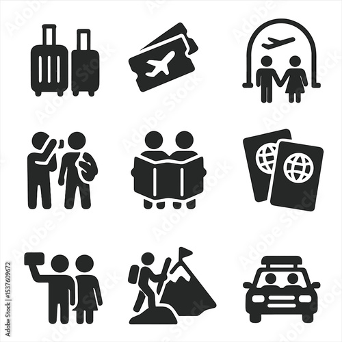 Travel Fashion Icons. Solid, filled icons set of couple travel fashion: passport icon, map in hand, airport