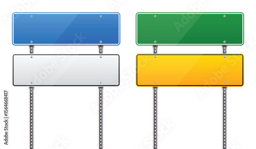 A pair of signposts with different colored signs against a white background. The signs offer visual guidance, with the blue, white, green, and yellow panels.