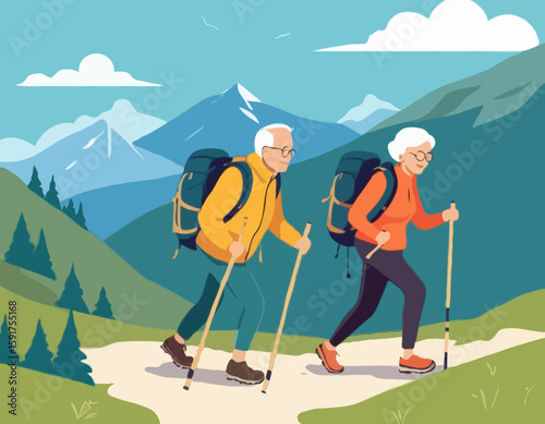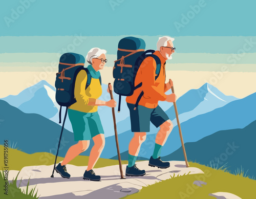 ハイキング旅行を楽しむシニア夫婦 カラフルで楽しいフラットイラスト