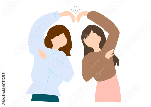 旅行先でSNS用に写真を撮る女性二人組 秋冬ファッションの女の子ベクター素材