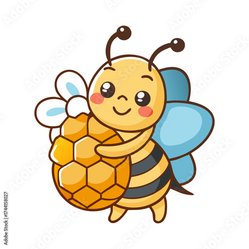 Cute cartoon bee flying with a bucket of honey and dripping nectar