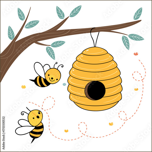 Blossom tree branch, hive and cute cartoon bee with honey jar. Happy insect with sweets, spring summer vector location. Childish bright illustration