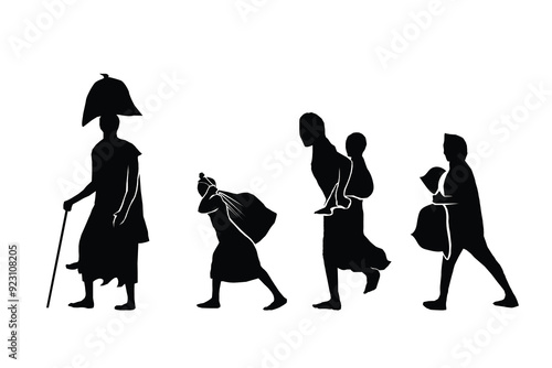 puppet show with human silhouettes manipulated by large hands, string control, monochrome vector graphic