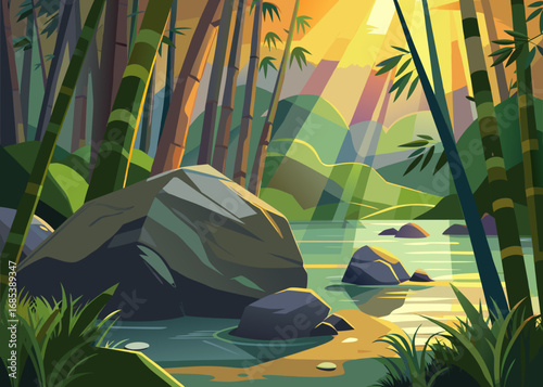 Abstract perspective grid with colorful geometric shapes and a receding horizon creating a sense of depth and dimensionality