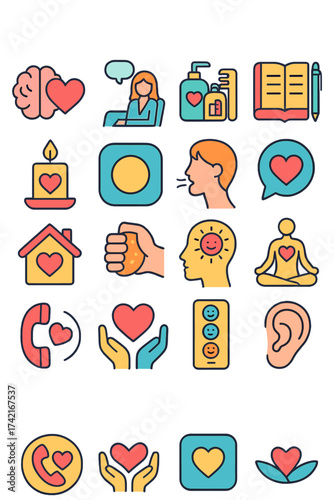 Resilience Icon Set. Emotional Resilience modern flat icons set: brain, leaf, shield, heart icon, waves, sunrise, journal, breathing symbol.