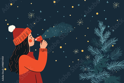 Person with hat blows horn, sparks float, on light blue. For greeting card