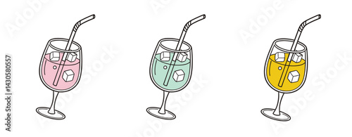 Cocktail drinks. Different alcoholic beverages. Popular bar menu. Various glasses. Exotic ingredients. Ice cubes and straw. Fresh tropical juice. Daiquiri and margarita. Garish vector set