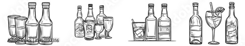 Set glass and bottle whiskey, wine, tequila, cognac, champagne. Vector engraving