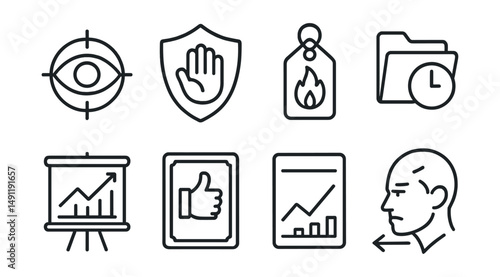 Line style icons of self-discipline: focus icon, self-control badge, motivation reminder tag, delayed gratification file, work ethic board, task completion chart, perseverance bubble, determined