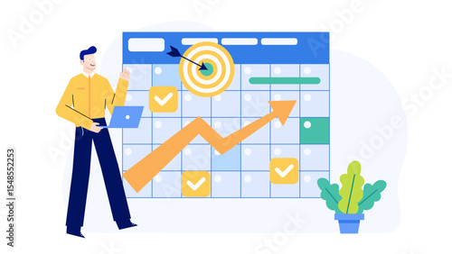 Man successfully completing tasks on a calendar. Ideal for productivity, time management, success, goalsetting, planning, and scheduling concepts.
