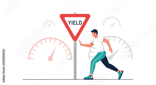 Man Stops Running By Yield Sign During Workout Or Competition Concept