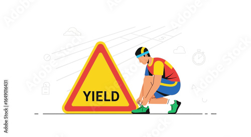 Marathon Runner Tying Shoelaces Before Race Beside a Yield Sign Illustration