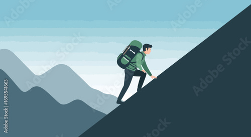 A person with backpack climbing the mountain to reach the top, vector cartoon illustration