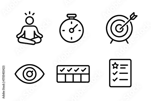 Self-Control Icon Set. Outline icon set of self-control: meditation, timer, no distractions, goal setting, focus, habit tracker,