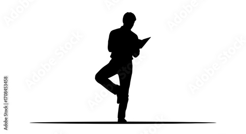 Confident businessman practicing balance while reading a book, symbolizing focus and clarity in business decisions.