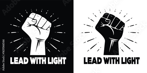 Raised fist symbol with radiating light and text lead with light, representing power, hope, and positive change through strong leadership