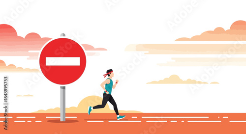 Marathon Runner Approaching Roundabout Sign Shows Perseverance Concept