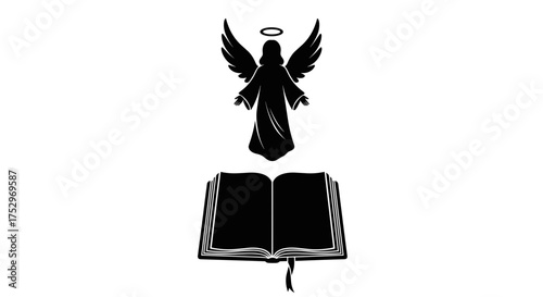 Open holy book illustration in black and white design. A classic vector representation focusing on scripture and sacred text.