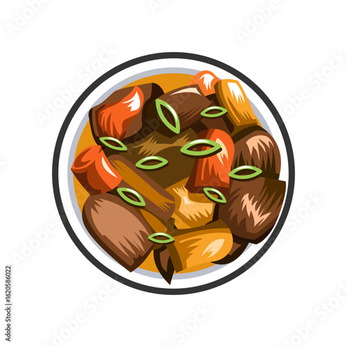 Top view of a delicious bowl of beef stew with carrots and green onions