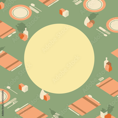 A stylized, isometric illustration of a dining setting with an empty space for design element.