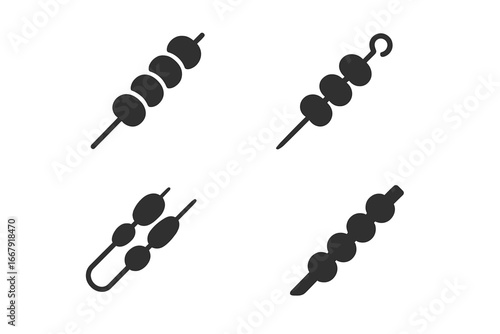 Skewer icon set for barbecue and grilling. Vector glyph collection of various kebab sticks, including bamboo, metal, double prong, and flat styles for food presentation.