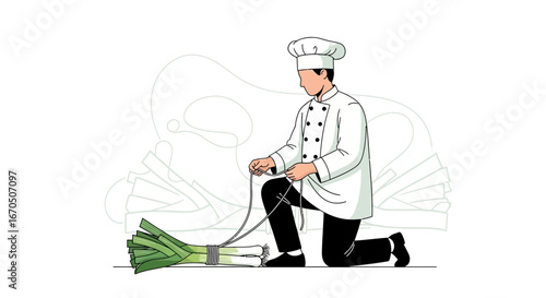 Culinary Chef Securing Fresh Leeks With String For Elegant Food Presentation
