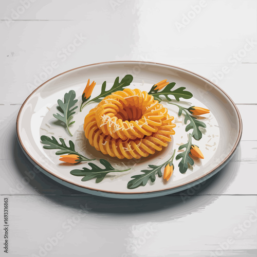 An elegant plate of beautifully arranged pasta spirals surrounded by greens and flowers, representing culinary art and creativity in food presentation.