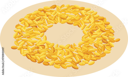Golden brown grains arranged in a precise circular ring on a white plate highlighting symmetry, organic texture, and natural elegance for food, wellness, and nutrition themes.