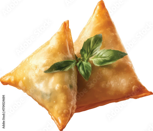 Two golden brown samosas garnished with fresh green basil leaves on a white background indian food
