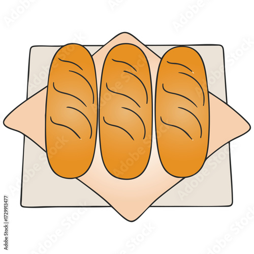 Three Golden French Baguettes Vector Illustration on Plate and Napkin. Freshly Baked Bread Loaves for Menu Design, Bakery Ad, or Food Presentation Graphic Vector illustration on white background