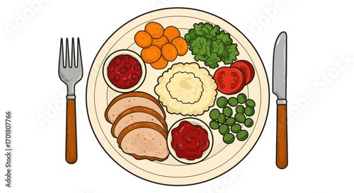 Hearty Thanksgiving dinner plate piled high with sliced turkey, creamy mashed potatoes, vibrant vegetables, and savory cranberry sauce ready for a festive feast.