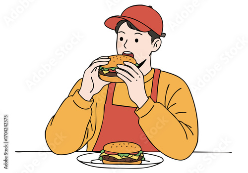A young Asian man in an apron enjoys a gourmet burger. He?s smiling and focused on the delicious meal. Bright colors and a clean composition.