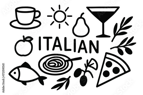Italian Food Icons Set with Pizza Fish Pasta Pear Tomato Drink Olive Branches in Minimalist Line Art Style