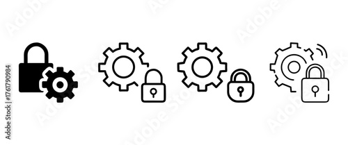 Security settings and privacy gear icons set – padlock, cogwheel, system protection, secure configuration, and access control outline vector illustrations