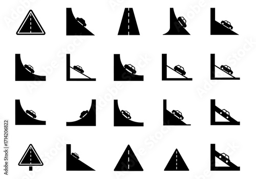 Set of stick figure icons depicting a person walking down stairs, illustrating concepts like descent, exit, downward progress, and direction.