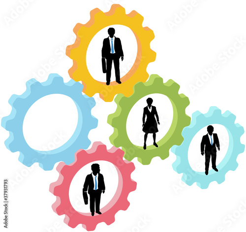 Teamwork collaborate to achieve business goal, team members help and support, cooperate or partnership concept, businessman and woman running on cogwheel or gears rotate in sync to get work done.