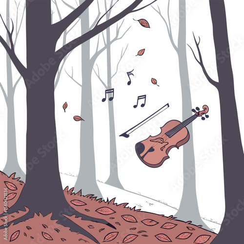 Illustration of a violin and bow floating in a forest with falling leaves and music notes around it alluding to autumn
