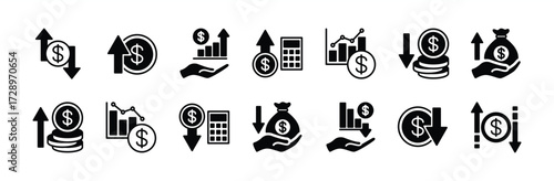 Profit and loss money thin line icon set. Financial growth and reduce statistical data graph, money, currency, sale, earnings, economy, exchange, trade. Increase and decrease arrow - illustration