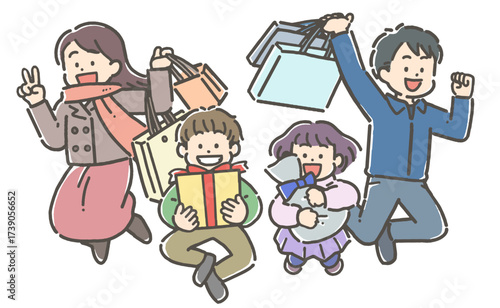 一緒に楽しくお出かけする若い家族 カラフルでお洒落な線画イラスト