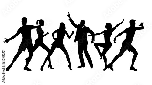 Dynamic silhouettes of people dancing in various styles, including a large group and solo poses, for performance and entertainment themes