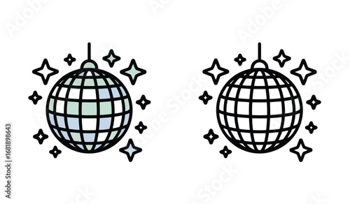 Disco ball icon set with linear, black and white pictograms. Nightclub shining mirror sphere symbol