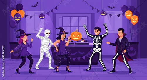 Halloween Party Dancing People in Costumes with Pumpkins and Balloons Celebration