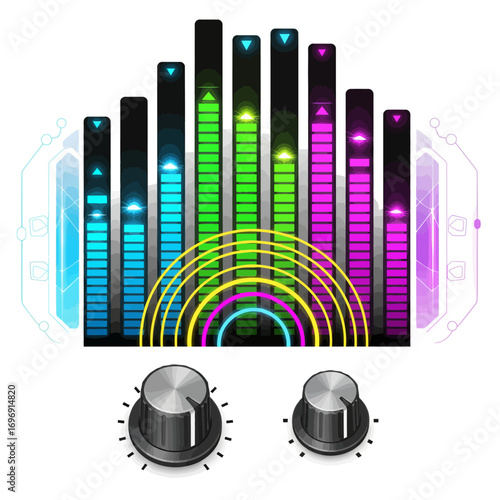 Neon-style dynamic range meter for music and audio, vector graphic with equalizer bars and control knobs