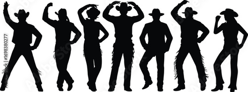 Silhouettes of seven cowboys and cowgirls posing, western hats, dancing, country style, cowboy outfits, fringe pants, wild west theme, dancing poses, energetic, outdoor vibe, group of people