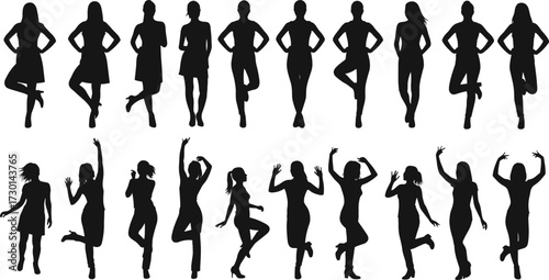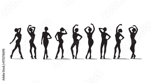 Silhouette of women in various standing and dancing poses, stylish female body figures, elegant models vector illustration, modern fashion design
