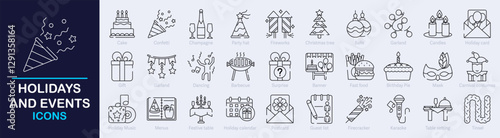 Party and Event Outline Vector Icon Collection. A set of outline icons related to celebration, party, decoration, cake, gift, birthday, holidays, dancing and more. Editable stroke. Vector illustration