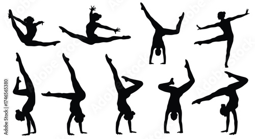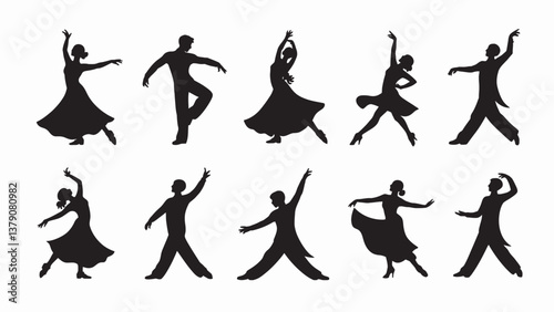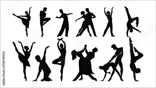 Silhouettes of male and female dancers performing various elegant dance poses, showcasing grace, movement, and artistic dance expressions vector illustration.