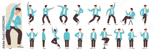 Boy on fun dance party in dynamic actions, side, front and back view set vector illustration. Cartoon excited young man dancing to music, drinking wine in armchair, posing isolated on white