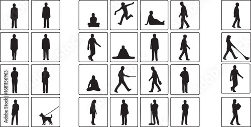 A diverse collection of human figures, including a dancing couple and individuals, presented as a black and white silhouette vector illustration set.