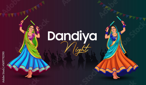 Garba Night poster for Navratri Dussehra festival of India. vector illustration design of peoples playing Dandiya dance.